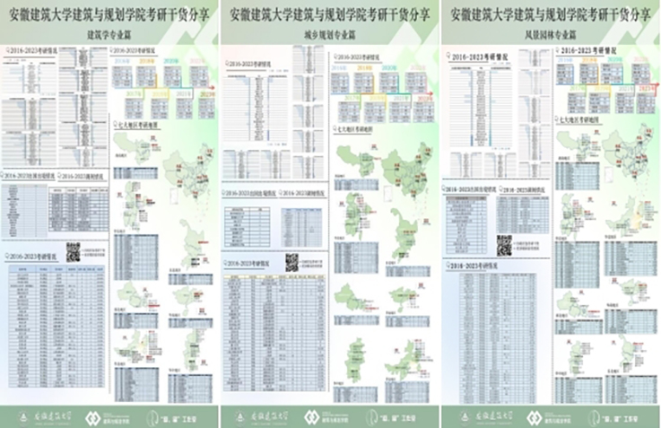 学院将建筑学、城乡规划、风景园林三个专业近几年的考研数据及全国三个专业可报考的院校可视化展示出来,为新生大学学习生涯指引方向。