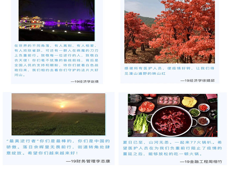 土木学院开展“点亮心灯,温暖你我”第三届心理微漫画比赛和“感谢有你—给感恩的人的一封信”活动,经管学院开展“‘疫’路同行,‘心’之所绘”心灵寄语活动,公管学院举办“三行情书-表白最可爱的人”征文比赛,数理学院开展“阳光心态,幸福人生”线上放飞感恩心愿漂流瓶活动,材化学院举办“青春年少,知恩图报”线上母亲节寄语大赛,外国语学院组织“体悟生活,共享美好”线上心理故事会活动等。通过各项活动的开展,营造了温暖健康的氛围,加强了学生的自我认知,引导着学生表达真实心声和真情告白感恩的人,促进了师生及学生之间的交流与合作,厚植了爱国主义情怀,播撒了希望的种子。