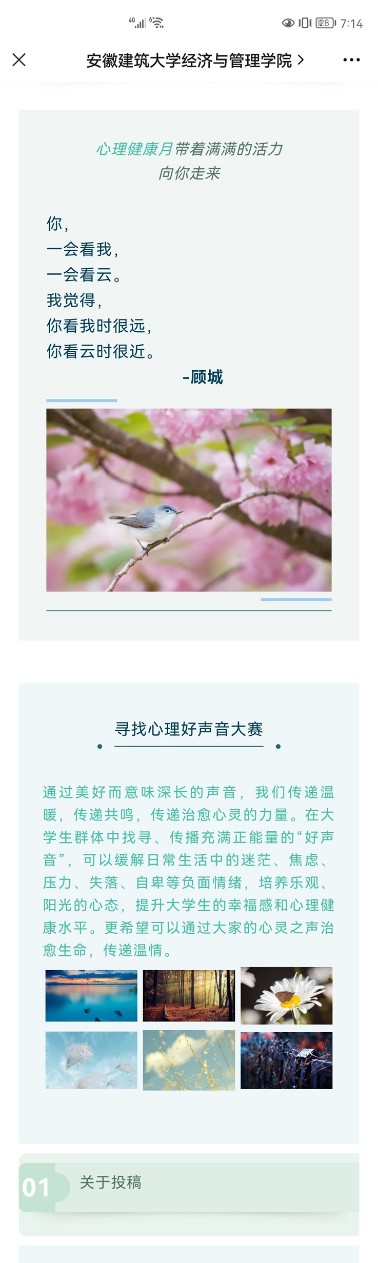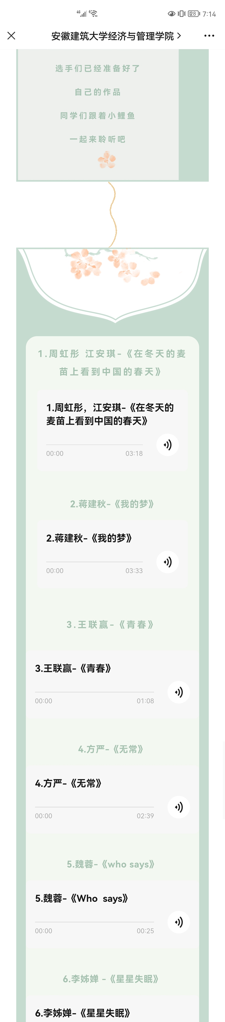 该活动旨在面向全院学生寻找能够给心灵提供慰藉或力量的声音,征集题材不限的音频作品。截至目前,寻找心灵好声音活动已征集到多份作品,作品题材涵盖散文朗诵、音乐鉴赏等,同学们就近期读书、音乐、创作的感悟进行分享,用声音传达力量、为心灵提供慰藉,近期对征集来的作品在学院公众号进行了评选展播,同学们积极参加投票,选出自己心中最爱的好声音。