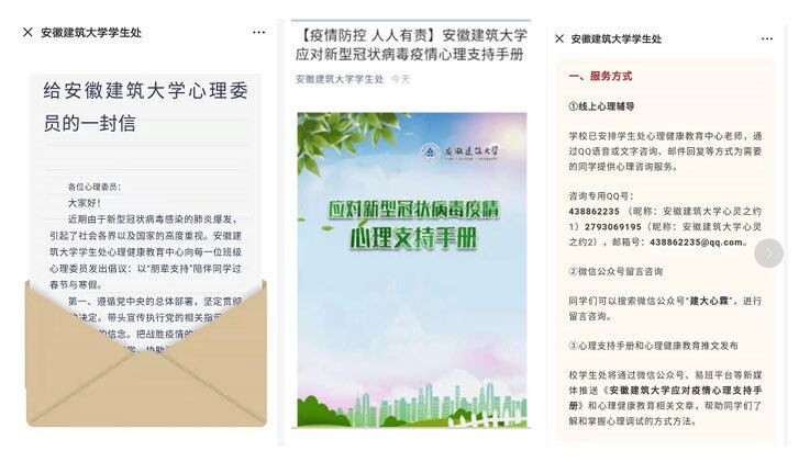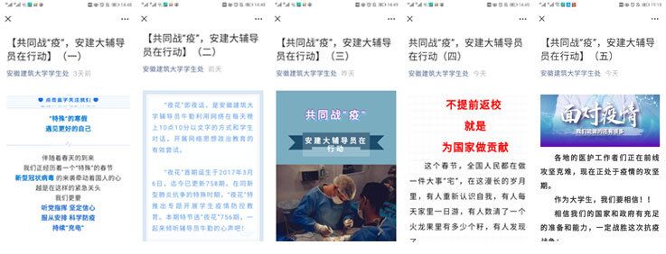 为做好疫情防控宣传教育工作,各辅导员充分利用学生处微信公众平台,每日转发,积极发声,全方位推送疫情防控知识。各学院辅导员积极转发、评论学生处微信公众平台【疫情防控人人有责】专题内容,引导学生自主学习防疫知识。在学生处统筹安排下,学校辅导员积极在学生处公众号开设的【共同抗“疫” 安建大辅导员在行动】专栏中发声,结合辅导员防疫工作,以视频班会、原创推文、动漫等形式,为居家学生宣讲中国战“疫”的进展和感人事迹、讲透防控要领、讲清人类传染病防治史、在线规划指导学生学习,并开展知识普及、科学建议、远程学习交流,和学生对话,为学生分忧,为师生架起沟通的桥梁,广受好评。