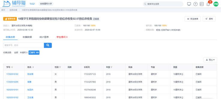 为准确摸排了解每一名学生的身体状况、出行情况和思想动态,建立详细防疫台账,学校辅导员利用辅导员协作平台(辅导猫),快速开展学生健康状况排查工作。一是利用“通知”功能发布通知信息,确保所有校方信息和有关知识普及信息点对点传达到位,精准推送提醒信息。二是利用“信息收集”功能,每日远程采集学生近况,特别是个人和家人身体健康状况,做到全覆盖、无遗漏。三是利用“签到”功能,关注学生每日行程,特别对于湖北籍学生居家隔离动态信息的全面掌握。