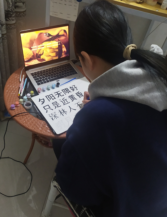 家中的器材条件自是不能与学校相比,但这并不能成为大家自我提升道路上的阻碍。一天的课程结束后,同学们各显神通,努力克服专业学习上所面临的硬件困难,认真完成作业,同时结合自身专业特点,积极开展相关艺术创作,为一线抗疫人员助威,为武汉加油。