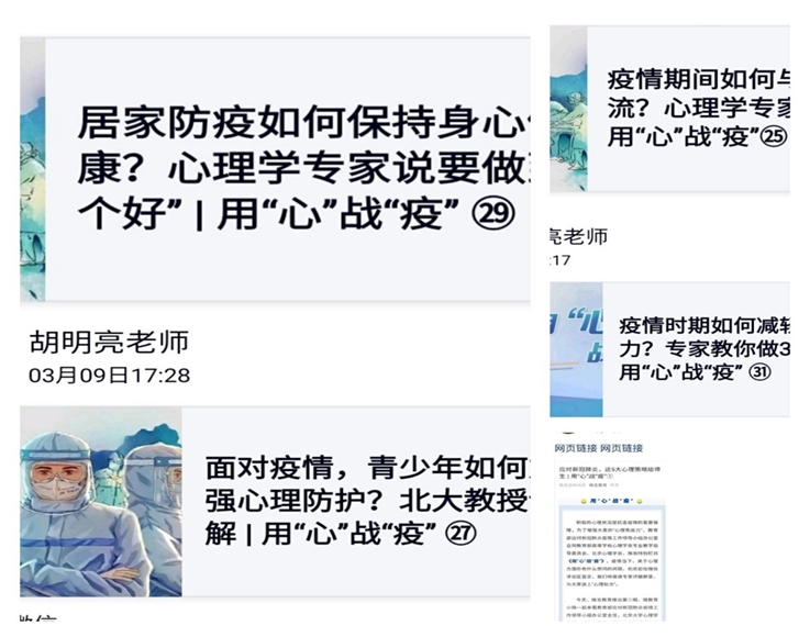 疫情影响我们的不仅仅是身体健康,还有心理健康。因此,通过分享一些“用心战疫”的推文,告诉学生们如何去克服心理问题。战疫情,也是战心情。