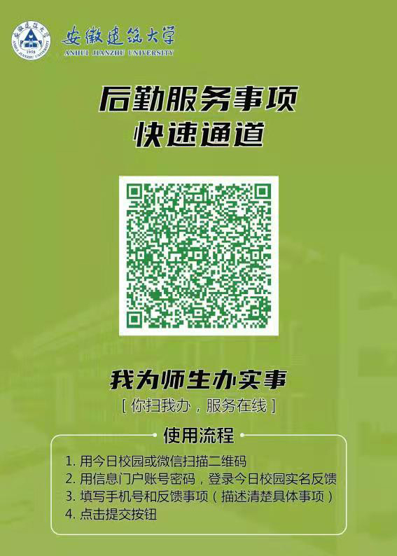五、温馨提示:此“快速通道”和“安建大微后勤我要报修”同步使用,学生宿舍事项,应通过“安建大微后勤我要报修”报送反馈,如24小时无响应,再通过“快速通道”扫码反馈。