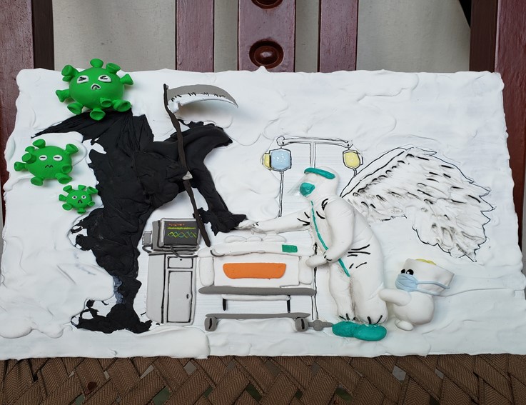 18级环境设计专业褚维旖采用超轻粘土创作的《白衣天使》描绘了白衣天使与死神和新冠病毒作斗争抢救病人的画面,体现了一线战疫者们无私奉献,面对疫情毫不退缩的精神,致敬前线抗疫英雄。