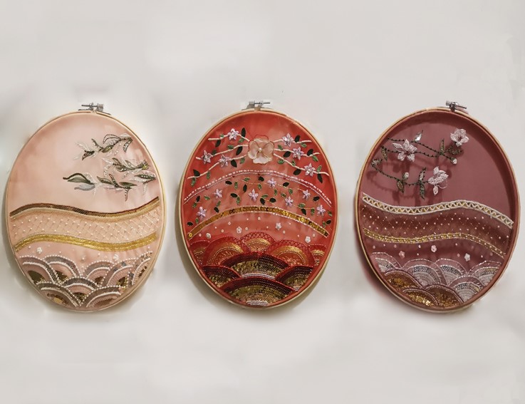 18级视觉传达设计专业陈嘉妍采用了米珠、亮片、金属线等材料,创作法式刺绣作品《繁花似锦》,体现了对疫情尽快结束的期盼。其灵感源于中式风格的花朵和纹路,通过一些重组以及搭配的设计,运用不同的技法做出各种样式的转变,以展示温暖充满希望的美好未来。