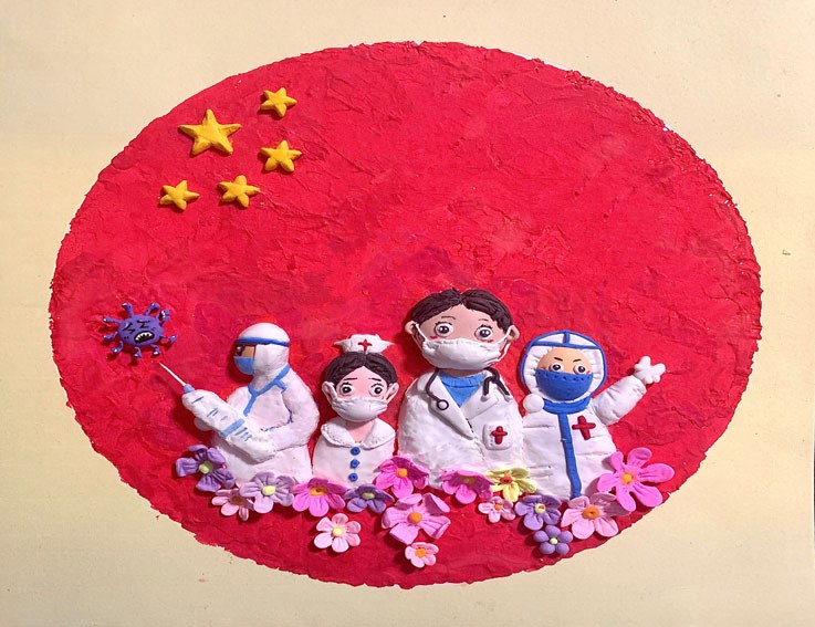 19级环境设计专业高洁采用粘土创作的《勇者无畏》描绘了白衣天使响应国家号召,放弃假期,义无反顾地投入防疫战斗中的场景,让我们感受到了战胜新型冠状病毒的信心和决心。