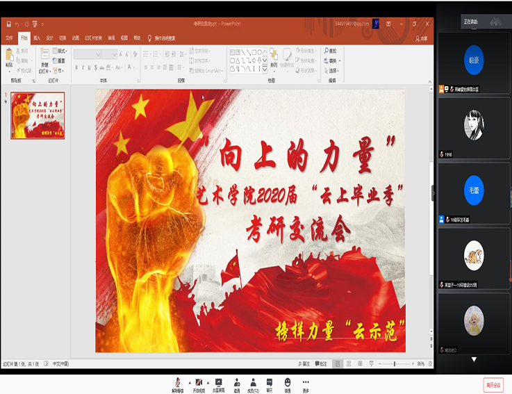 本网讯 本微末凡尘,但心向天空。为进一步加强同学们对研究生入学考试的认识,了解前沿的考研形势,增强考研斗志,艺术学院于6月17日举办“向上的力量—云上毕业季考研交流会”。