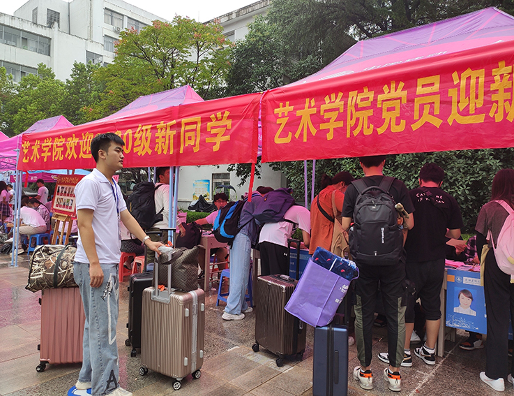 迎新的老师和志愿者们冒雨忙碌的身影如一道道美丽的风景线,周密的安排、亲切的问候、贴心的服务、真诚的祝福,温暖了每一位艺术学院新同学。