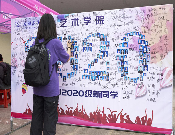 艺术学院还为新生们准备了入学签名纪念板,用同学们充满阳光笑容的照片与充满期盼的留言组成了色彩斑斓的照片墙。这洋溢着青春活力的群像展板既是四年大学生活的起跑线,也将会是未来毕业时同学们珍贵回忆的一页。
