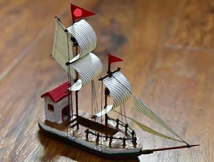 20公共艺术葛梦成同学利用废弃的竹签、木块和纸片,通过重新打磨、上色与组合,拼接成了微型帆船模型,充分发掘蕴藏在边角废料之中的潜在艺术之美,体现了“长风破浪会有时,直挂云帆济沧海”的乐观态度。