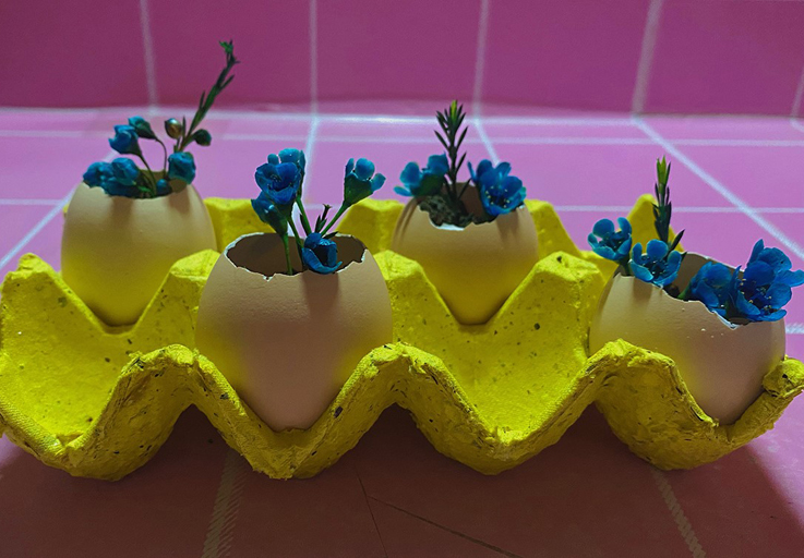 19视觉传达设计胡小萌同学用清水洗净废弃蛋壳里面的黏膜,加入一些土壤承载绿植,简单的操作让废弃的蛋壳有了新的生命,放在书桌上别有韵味。