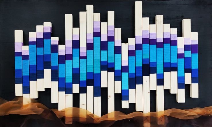 18视觉传达高洋同学将废弃的木棍、线等装饰材料做成装饰画,实虚相间的欧根纱若隐若现悬浮于底部,如一缕轻云一般点缀作品,作品整体采用蓝紫色调渐变,既好似云端晴空,又彷如海水轻盈,更如同琴键错落,将自然之美与音乐之美相融合,给人以视觉上的舒适感。