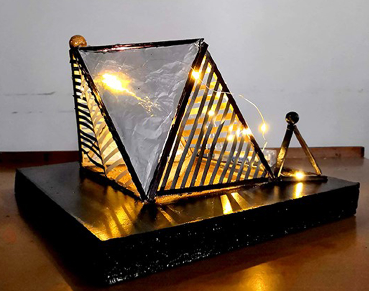 18环境设计杜忱洋同学利用废旧的快递纸板及纸张,通过粘贴、组合、刷黑色涂料和金粉的方式,设计出一款造型独特的手工台灯,通过线条与几何图形的组合,将平平无奇的废旧纸板变废为宝,既美观又实用。