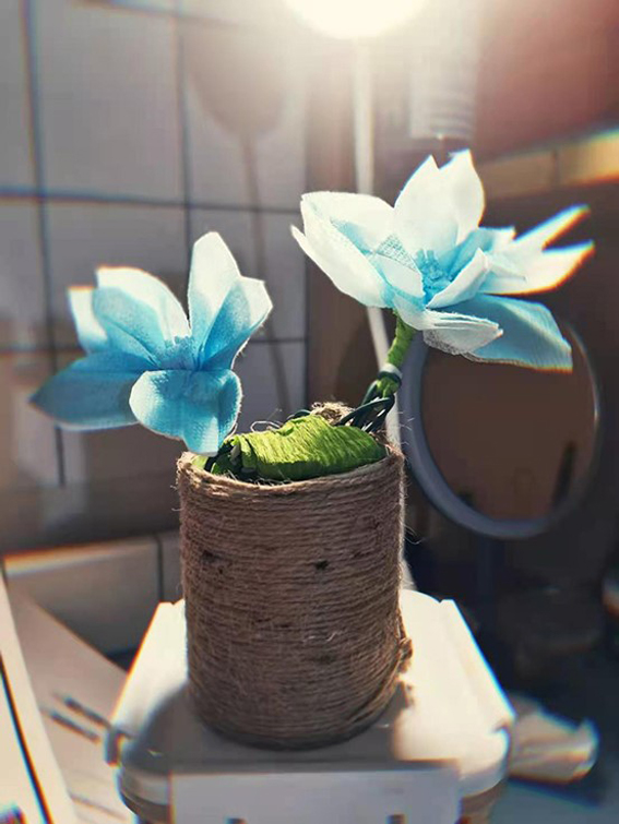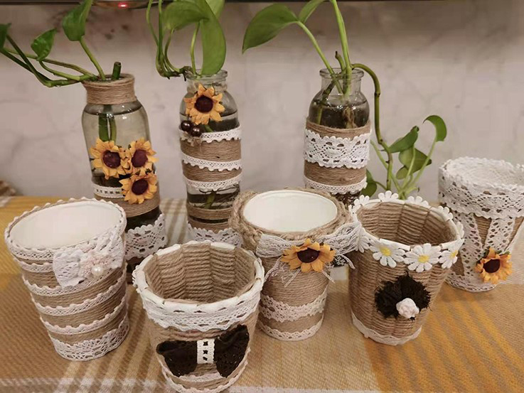 18环境设计张艺馨同学选用废弃的玻璃瓶、纸杯作为改造材料,将米色麻绳缠绕在其内外,并用编织的穗子和蕾丝布条等辅助材料加以装饰,废旧容器摇身一变,成为清新雅致的花盆,既绿色环保,又增添居家趣味,呈现出一种田园牧歌的自然美感。