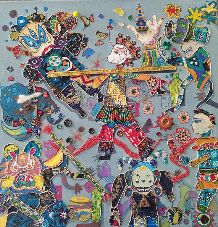 19视觉传达设计韩艳同学采用剩余布料、水粉绘画、废旧纽扣、木珠子、管珠、毛线、蜡绳、彩色亮片、玻璃方块、绒球等作为材料,制作了一幅五彩斑斓的拼贴画。该作品以中国传统故事《大闹天宫》为主题,活灵活现地凸显了孙悟空、杨戬、白虎、巨灵神、哪吒、太上老君、李婧、罗猴和天兵天将等人物形象,呈现了孙悟空大闹天宫后各路神仙前来擒拿的一幕,人物神韵跃然纸上。