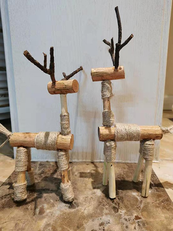 18环境设计张艺馨同学选用废弃干树枝作为创作材料,摆出头、脖子、腿及鹿角造型并用热熔胶进行粘粘连结,最后用细米色麻绳均匀密集的缠在长颈鹿各部位的连接处及关节处。树木总是无私奉献,而干枯的树枝经过改造重获新生,成为精致可爱的长颈鹿摆件。