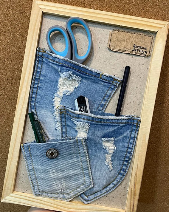 18环境设计黄一晨同学选用废弃的牛仔裤,将它们沿着缝纫线裁剪下来,装订在旧画框上,再采用热熔胶将画框和牛仔布料粘连在一起,做成了墙面创意收纳袋。蓝色牛仔布料与黄色木框的色彩相融合,以柔和的视觉效果与温暖的色调,为生活空间增添了一抹暖意与舒适