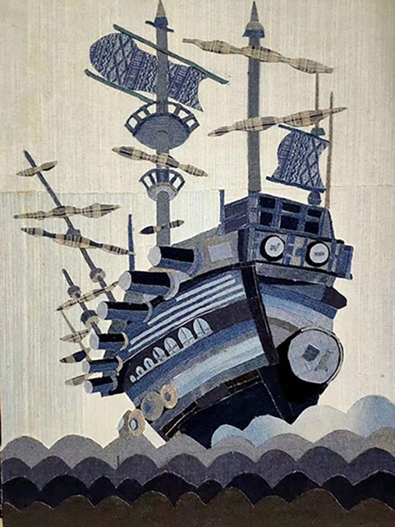 18视觉传达设计王经纬同学使用废旧的牛仔布和木板,将牛仔裤裁开后在木板上粘贴成船的形象,牛仔布的蓝色与海洋的色调相得益彰,带来了一丝氤氲着海风的凉爽。