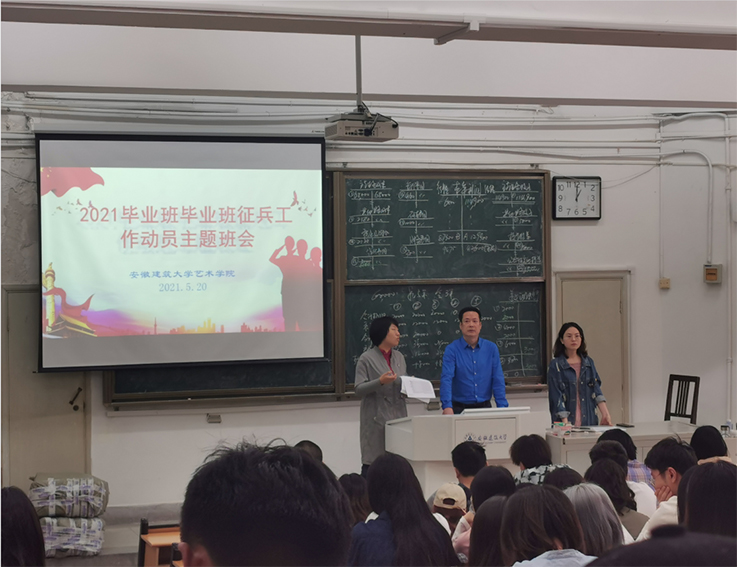 本网讯 为吸引更多高素质青年参军入伍,宣传国家和我省有关政策,艺术学院于5月21日召开“报名应征磨励志,保卫祖国展豪情”主题征兵动员大会。