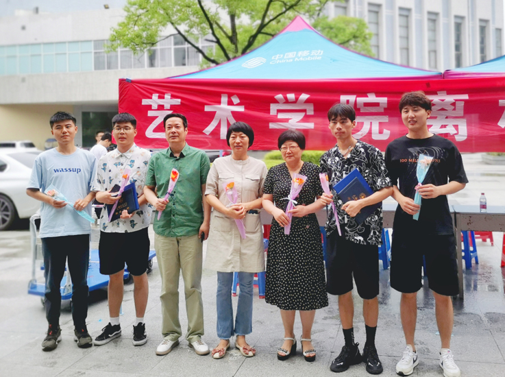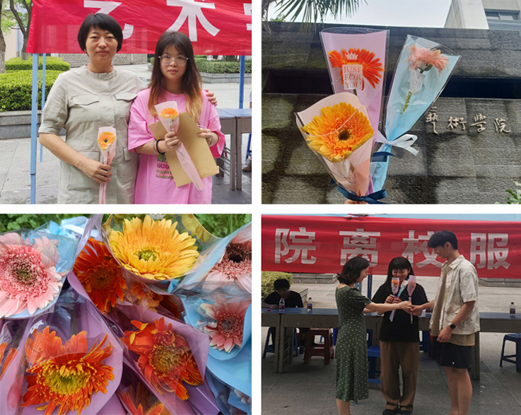 艺术学院毕业生离校服务站前,同学们为毕业的学长学姐送上鲜花,辅导员老师与毕业生亲切交谈,询问同学的行程安排、就业状况、人生规划等,并握手告别,祝愿他们一路平安,前程似锦。