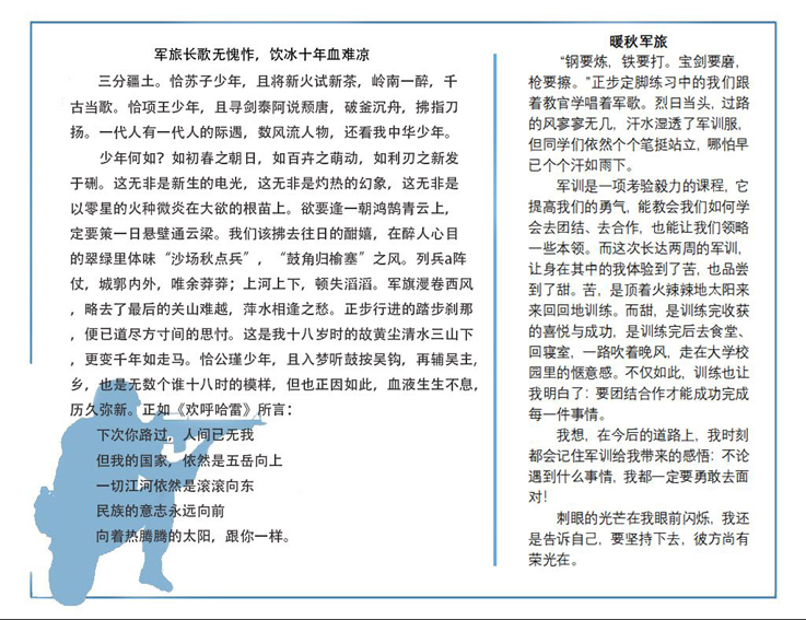 本次征文活动提高了同学们对于军训活动的理解与认识。九月留下了同学们的美好回忆,留下了同学们的青春步伐,也为同学们教授了“青春校园第一课”。愿新同学们能够尽快适应大学校园生活,让青春的活力充满校园。(作者:孙长玥 万顾可馨 王迪;审稿:潘青)
