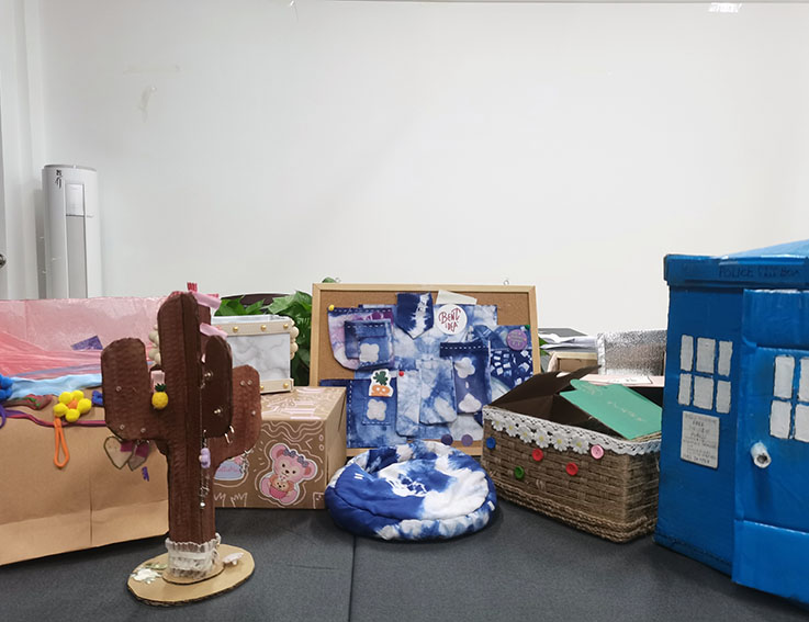 为最大程度利用宿舍空间,同学们选用各种废旧材料,制作出既实用又美观的宿舍收纳物品。有采用传统蓝染的方式,把旧T恤扎染后做成收纳,使作品更有温度、具有生活气息;有的同学则是利用快递盒,麻绳,纽扣等,采用柳编的形式做成收纳箱,不仅做到了废物利用,更锻炼了动手能力,感受了中国民间传统手工的魅力。一件件精美的收纳作品,不仅更有效利用空间、美化整洁了宿舍,更展现了新时代精致女孩、男孩的生活态度。