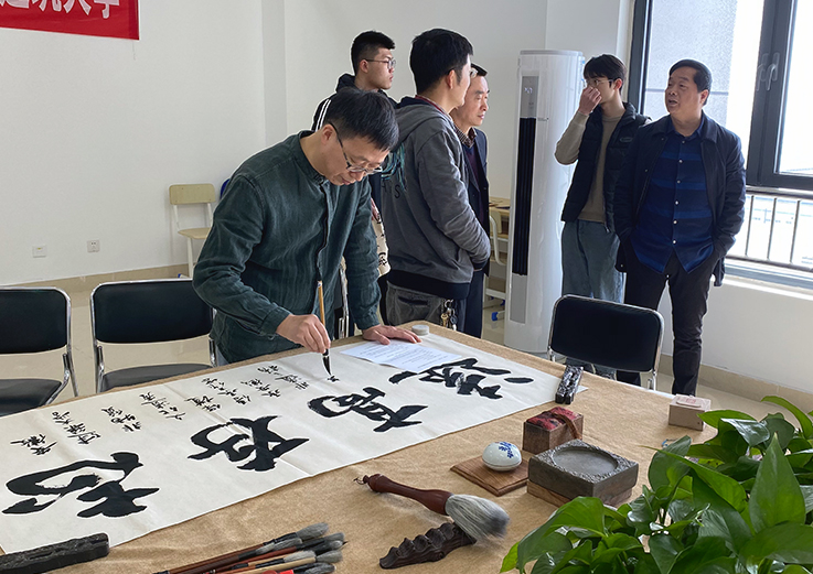 安徽省文艺理论研究室主任、安徽省文艺评论家协会副主席史培刚,安徽省文艺评论家协会副主席兼美术评论委员会主任、安徽美术出版社副总编、安徽省教育委员会书法教育专业委员会副秘书长秦金根、安徽文艺理论研究室助理研究员范倩倩等专家到访交流校。校督导员成祖德教授、艺术学院领导班子、非物质文化遗产保护传承团队成员等出席本次活动。