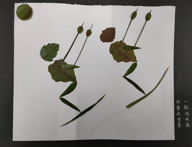 20级环境设计专业段嘉怡的创作作品《一起向未来》根据滑雪运动进行创作,用树叶拼成两个滑雪运动员,意在表达坚持就是胜利,爱拼才会赢。