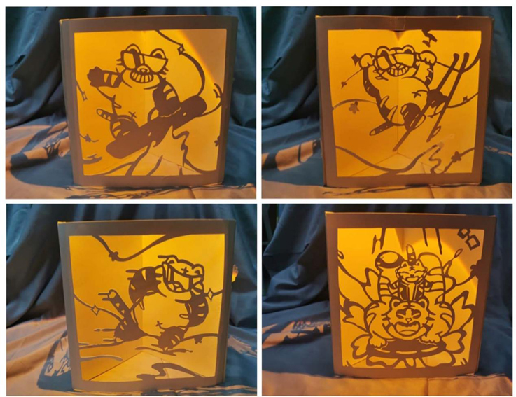 19级视觉传达设计专业张潮的作品《猛虎冲刺》采用纸雕的形式将四幅纸雕组成一个完整的立体制作类手工作品。四幅作品通过二次创作网络上的插画作品,将图画转为纸上雕刻的手工作品,分别体现了“短道速滑”、“单板滑雪大跳台”“跳台滑雪”“雪橇”四个冬奥会比赛项目,并结合了2022虎年元素,让可爱的老虎也参与了冬奥会比赛。