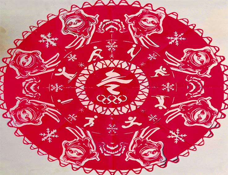 20级环境设计专业刘志华采用剪纸的手法创作作品《一踏冰雪意气生》,以冬奥会会徽为中心,里层为鸟巢简易图形及各个冬奥体育项目,外围则是由冰墩墩、牡丹花与冬奥主题雪花构成,可爱的冰墩墩正踩着雪板与我们一起奔向未来。