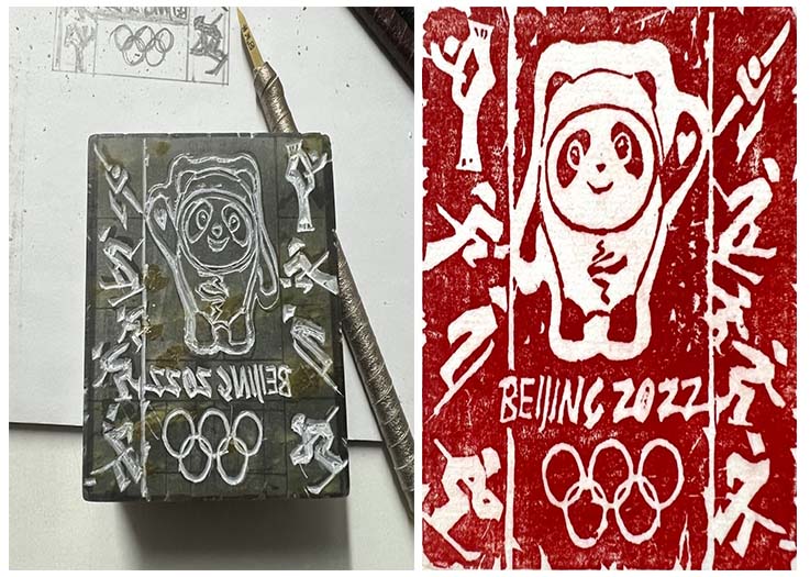 20级视觉传达专业郭俊然创作的作品《冰雪圆舞曲》运用刻章的手法展现了冬奥会的吉祥物冰墩墩、BEIJING 2022 和五环标志、以及花样滑冰、冰壶、跳台滑雪、高山滑雪、速度滑冰、越野滑雪、短道速滑、冰球八大冬季奥运会比赛项目,以此向冬奥健儿们致敬。