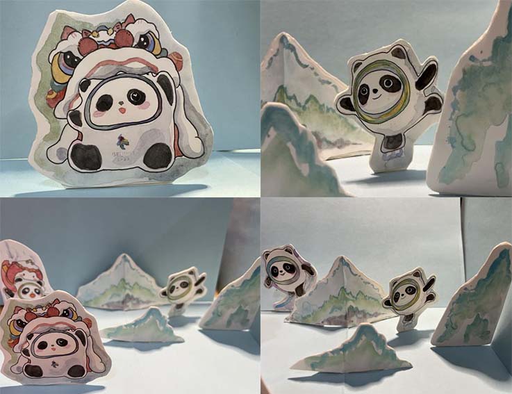 20级视觉传达设计专业彭嘉楠的作品《墩墩的冰上日记》以各类冬奥会运动项目为灵感,融合了虎年春晚热门《只此青绿》中王希孟的《千里江山图》的元素,象征着祖国大好河山繁荣兴盛之景,表达了对祖国的美好祝福。