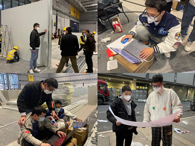 为确保方舱医院顺利完成,深化设计的工作极其重要,需要快速反应。以王昱博为现场设计小组组长,康声远、孙磊等设计师组建的深化设计团队,秉持初心,克服了现场办公难,食宿不便等难题,每天只睡不到三个小时,经过96小时鏖战,完成3号馆、4号馆建筑面积近3万平方米轻钢龙骨架设、彩钢夹芯板起竖、移动洗漱间安置、电缆敷设,地胶铺贴等工作,提供了6748张床位。在时间节点内快速、高质量交付,为上海打赢疫情防控攻坚战提供有力保障!(作者:孙磊 潘青;审稿:张红亚)
