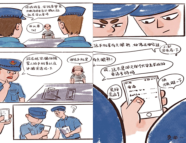 同学们积极发挥专业能力,在绘制过程中查阅大量关于网络电信诈骗相关资料,了解诈骗常见手段和话术的识别技巧,将查阅到的资料融入漫画之中。经过一系列艺术加工,绘制出一篇篇趣味横生又富有教育和警醒意义的防诈骗短篇漫画。
