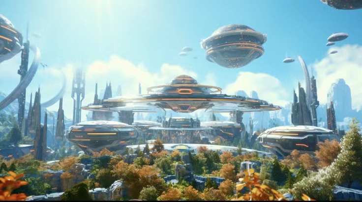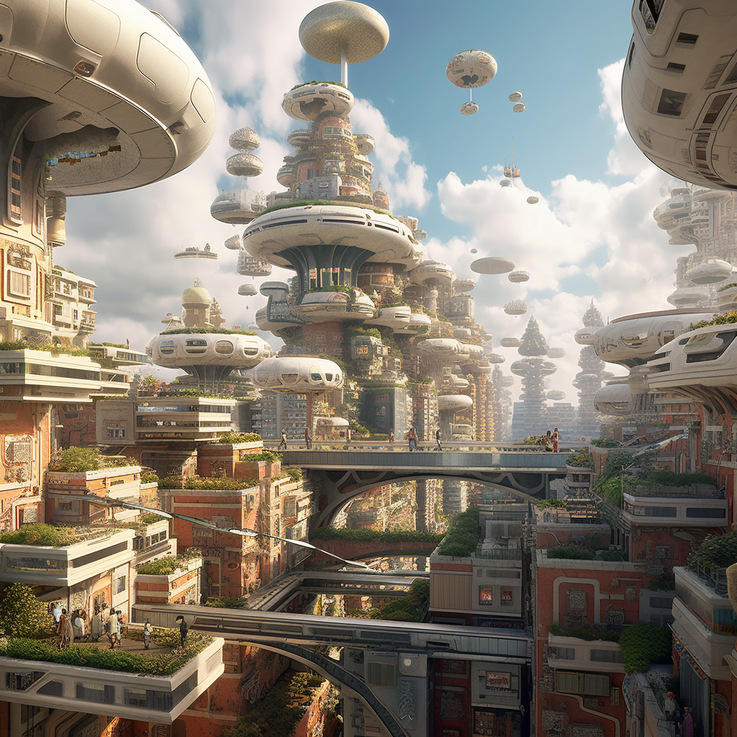 同学们共同展望,用梦想描绘出心中十年后的中国城市面貌。陈艺文以多形态且富有艺术感、满足居住功能和审美需求统一的设计理念,以部分建筑为例对多个建筑发散性思维畅想,利用生成式人工智能绘画工具,展现了一系列以立体化空间利用与开发为主旨的未来科技建筑畅想,尝试表达一种在形式美与实用美相融合的未来建筑图景。