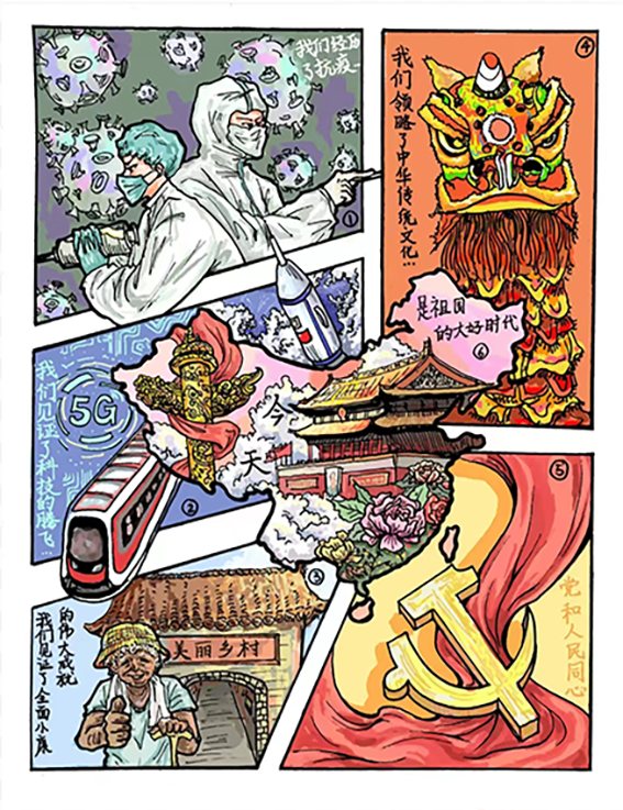 22公共艺术的马雯雯同学运用漫画的形式,从“抗击疫情”、“脱贫攻坚”、“5G速度”等视角,描绘了党和国家事业取得的历史性成就展现了中华民族自信自强、守正创新,踔厉奋发、勇毅前行的精神品质